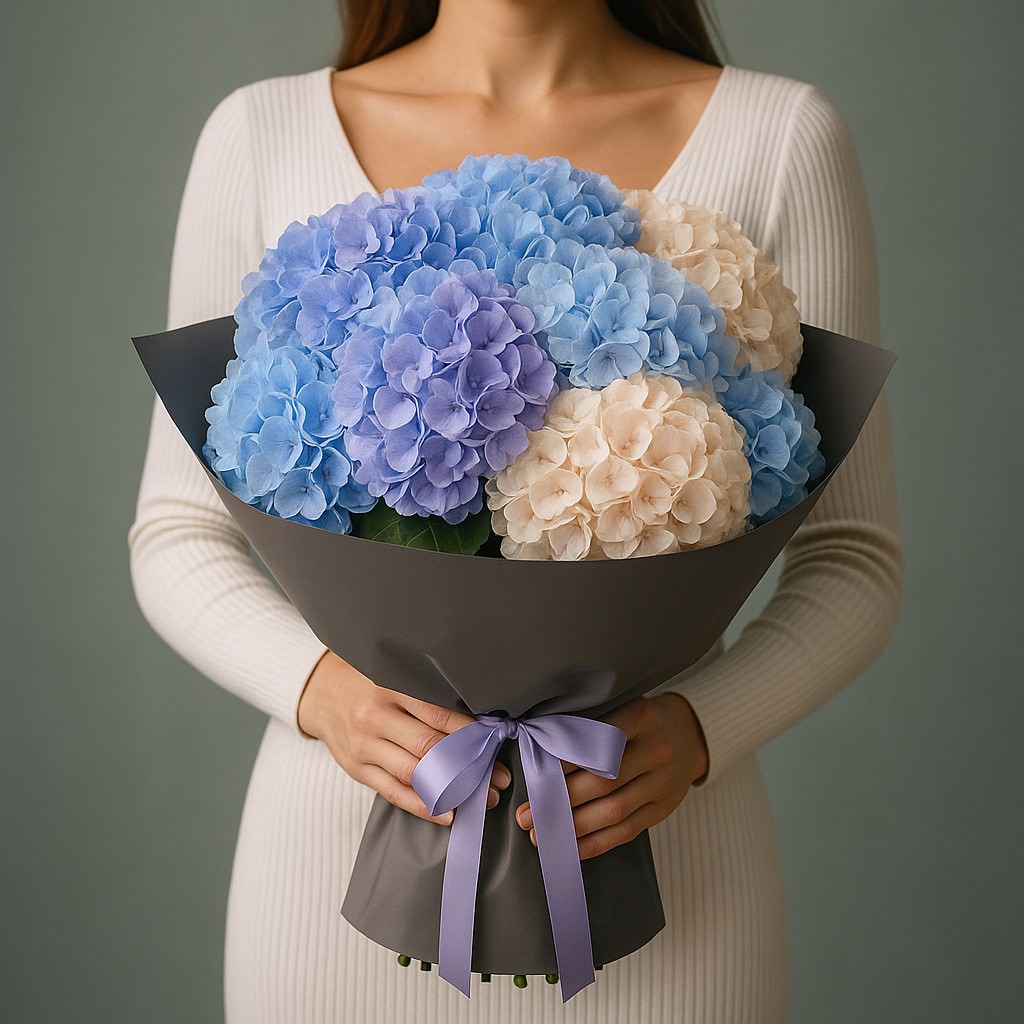 Нежный букет с воздушными гортензиями в мягких пастельных оттенках сиреневого, голубого и кремового — воплощение утончённости и гармонии. Такой подарок подчеркнёт изящество момента и станет символом спокойствия и нежности. Идеален для поздравления близких, романтического свидания или как знак искреннего внимания.